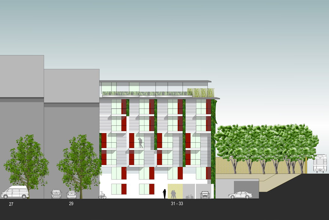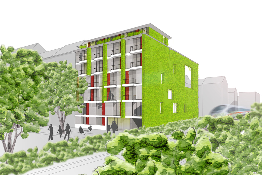 Eine 6-geschossige begrünte Lärmschutzwand schirmt die Wohnungen und den anschließenden Blockinnenbereich von den Geräuschen der Bahn ab und wird zum bestimmenden Motiv des Entwurfes.